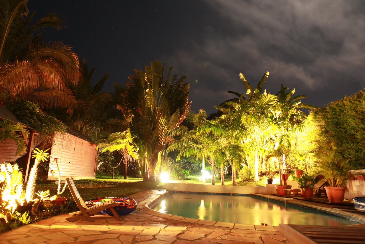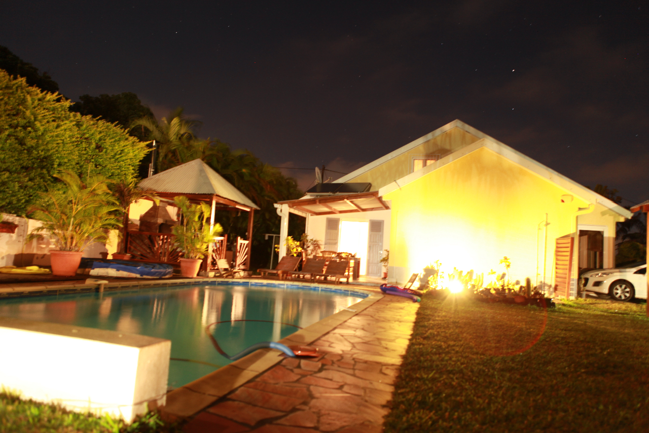 piscine et jardin de la location de nuit, tout illuminé pour pouvoir apprécier la fraicheur des nuits réunionnaises et le jardin la nuit.