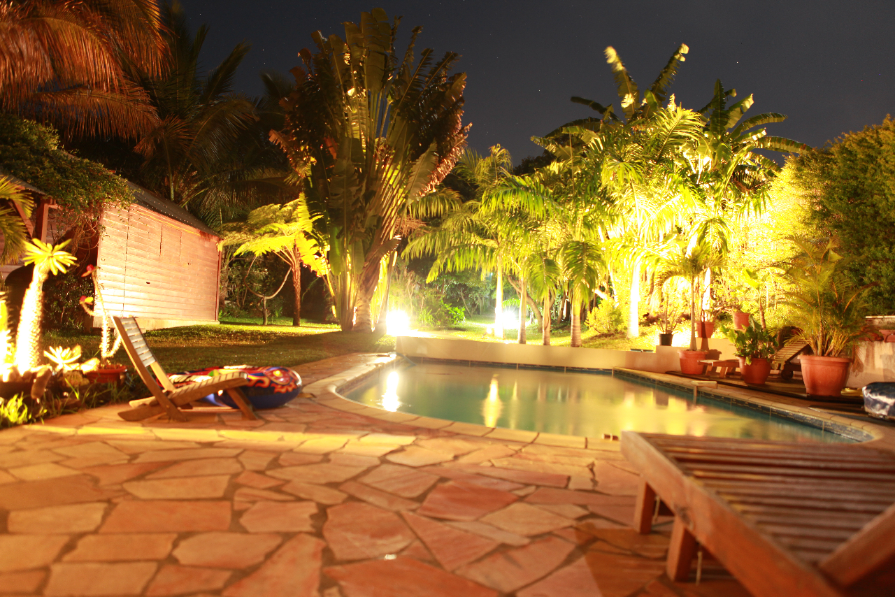 piscine et jardin de la location de nuit, tout illuminé pour pouvoir apprécier la fraicheur des nuits réunionnaises et le jardin la nuit.