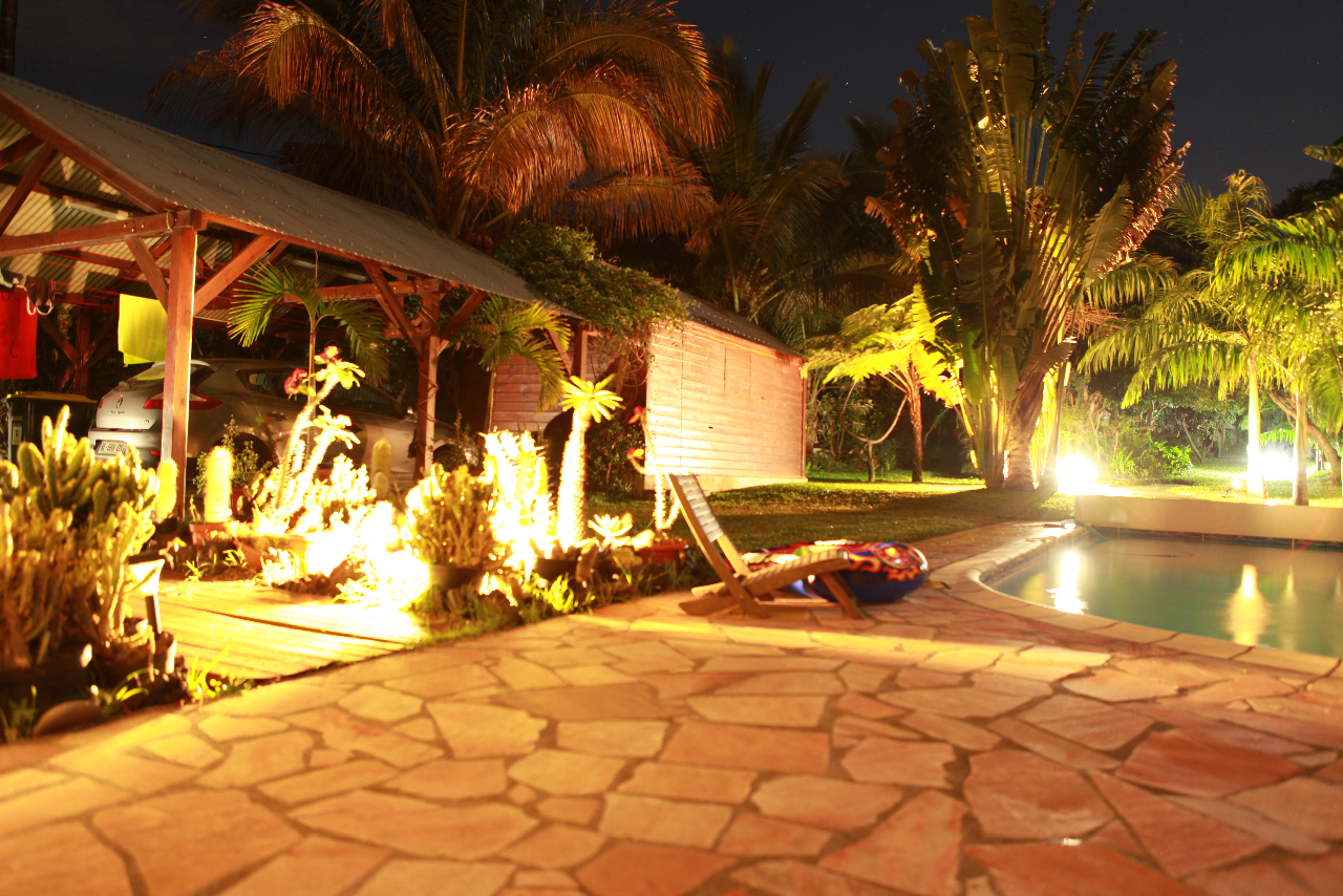 Le jardin même de nuit est fonctionnelle avec ces lumières qui balisent le parcours et éclairent les arbres, cette location est aménagée également pour vivre pleinement les nuits étoilées de la Réunion.